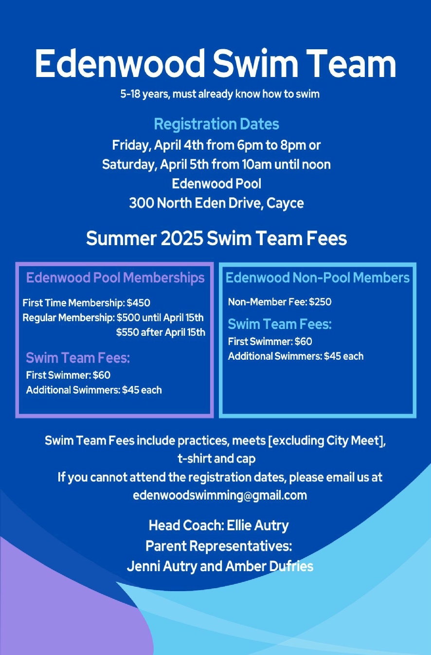 Swim team is beginning with parent meeting on May 5, Dry Land practice on May 6, and first practice in pool on May 7.